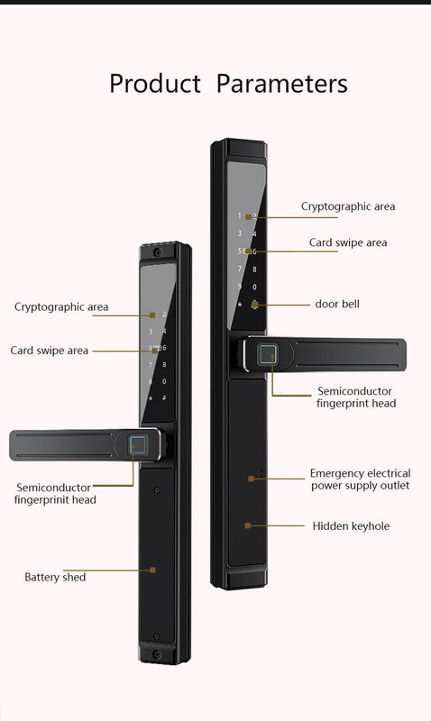 | Μέθοδοι Ξεκλειδώματος | Tuya/TTlock, Κωδικός πρόσβασης, Δακτυλικό αποτύπωμα, Κάρτα, Κλειδί, Θύρα USB |